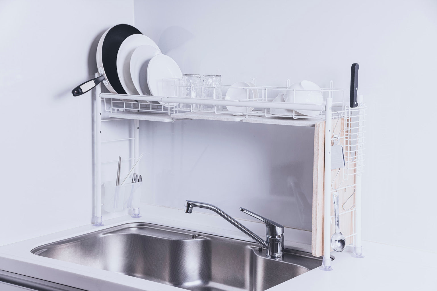 ・キッチンのスペースを有効活用できる、シンク上タイプの水切りラックです。 作業スペースの確保はもちろん、水切りカゴが目の前にあることで、洗い物作業時の動線がより効率的に。