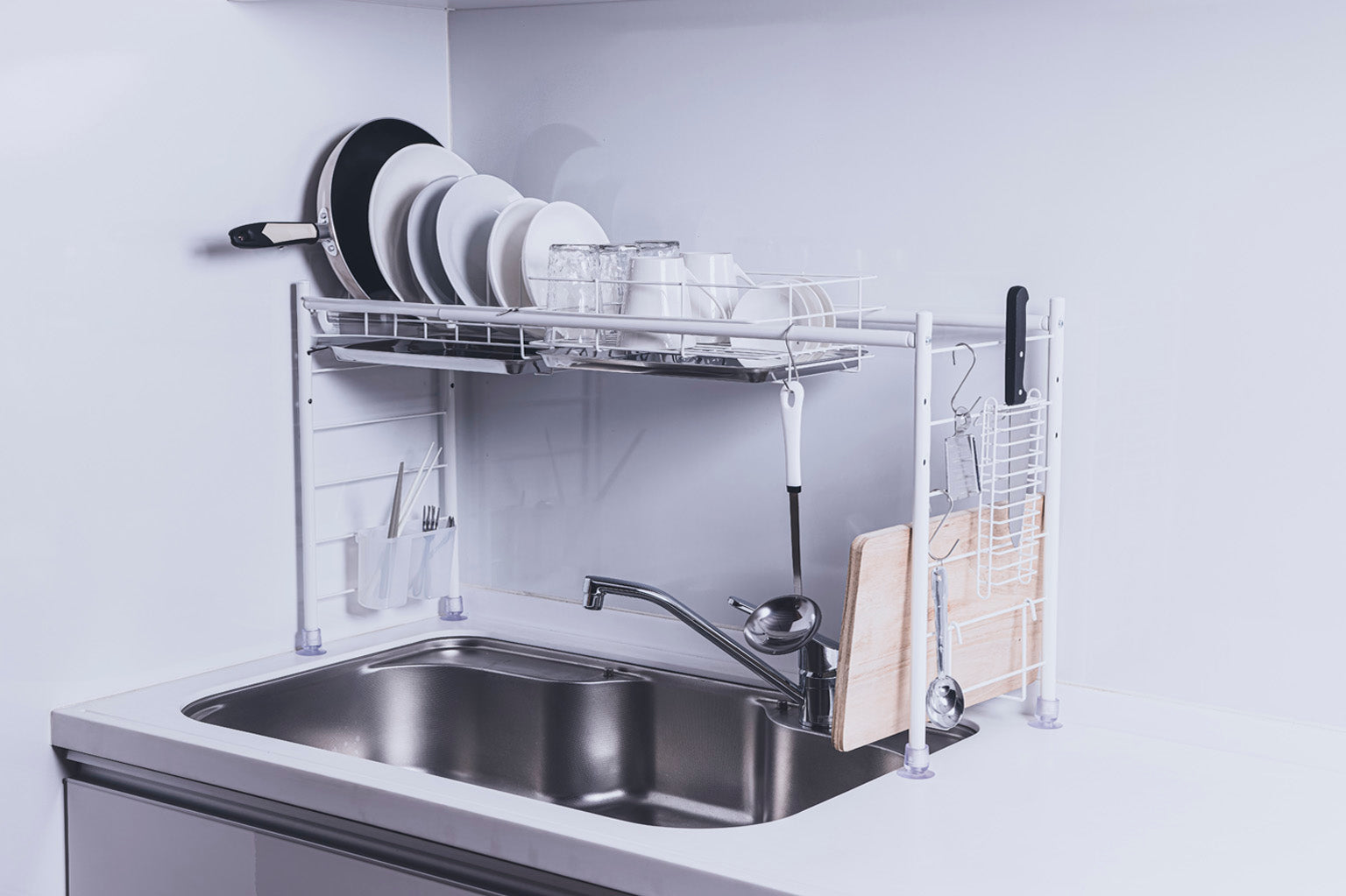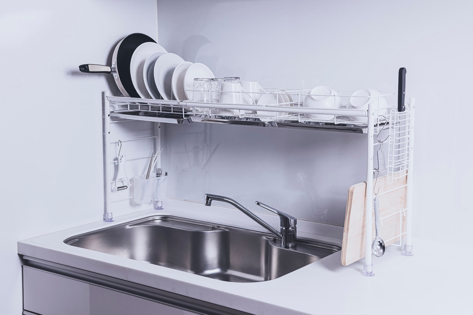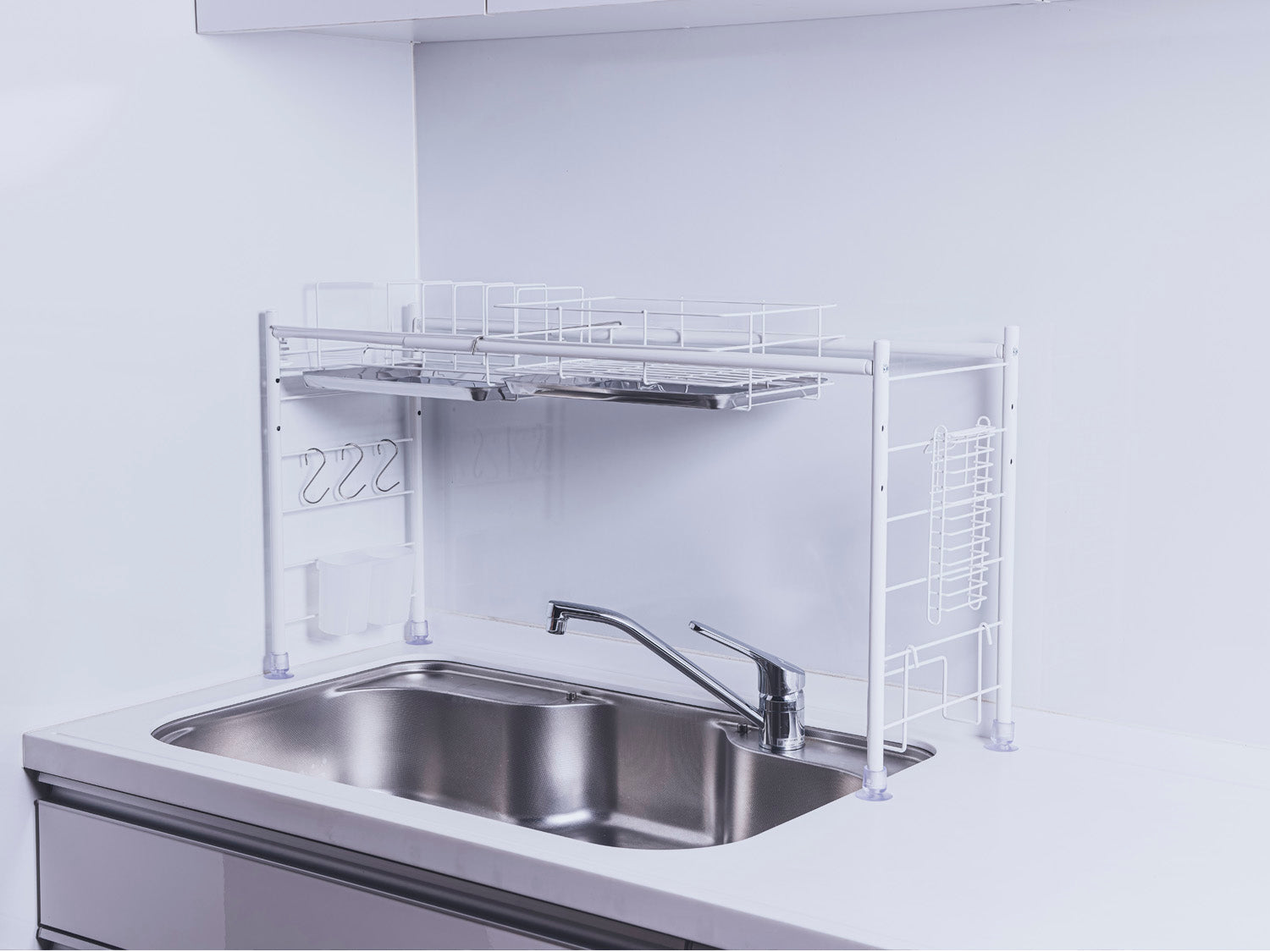 ・キッチンのスペースを有効活用できる、シンク上タイプの水切りラックです。 作業スペースの確保はもちろん、水切りカゴが目の前にあることで、洗い物作業時の動線がより効率的に。