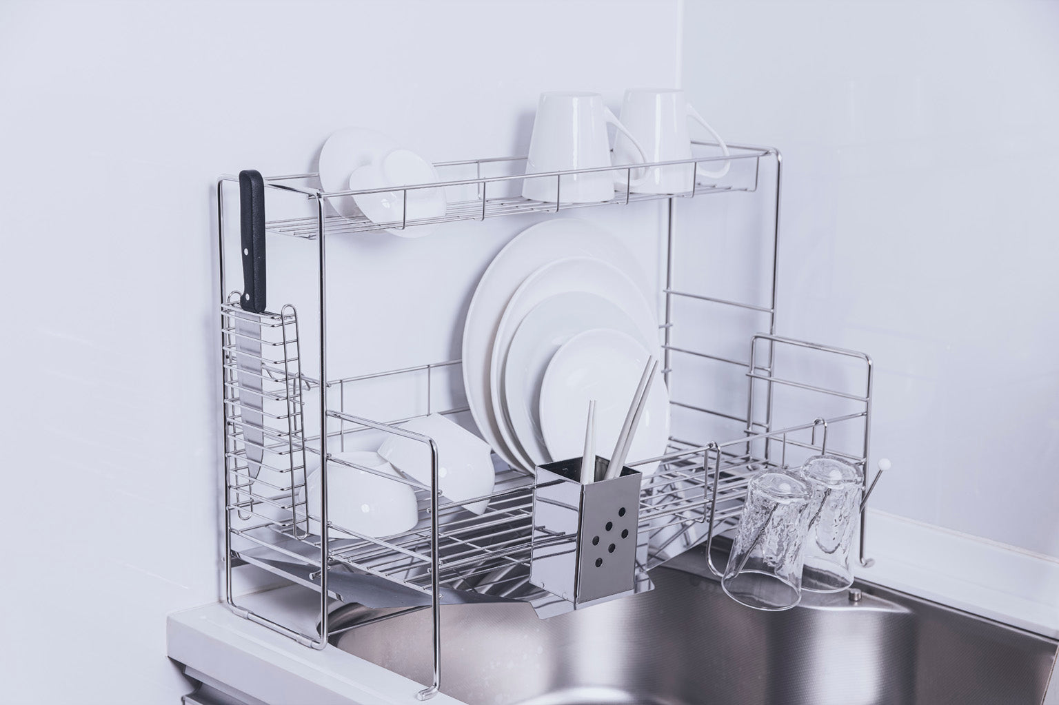 水切りカゴの幅が伸縮する、スライド水切りラックの2段タイプです。付属品の有無でお選びください。